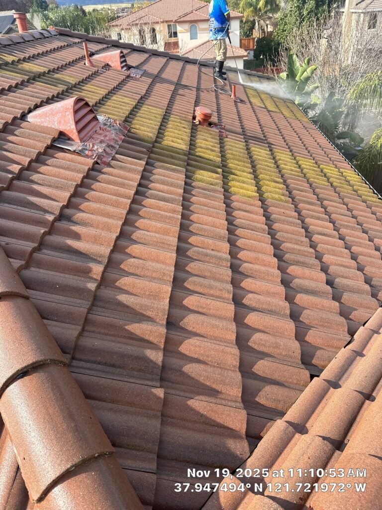 Tile Roofs — The Underlayment Problem This is the detail most homeowners do not know until it is too late. Tile itself — whether clay barrel, concrete flat, or Spanish mission style — can last 50 to 100 years. But the waterproof underlayment beneath the tiles has a much shorter functional lifespan, and biological contamination accelerates its failure dramatically. Moss and lichen that grow in tile joints and barrel recesses trap moisture against the underlayment continuously. Over time, this sustained moisture exposure degrades the underlayment material. When the underlayment fails, water infiltration begins — and repairing it requires removing and reinstalling the tile surface above it. That is a full re-roofing cost on a roof whose tiles themselves are structurally sound. Regular soft wash cleaning that removes biological growth from tile joints prevents the moisture retention that destroys the underlayment beneath.